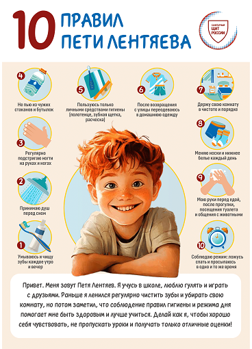 15.10.202410 правил Пети ЛентяеваТворческая работа одного из победителей Всероссийского конкурса детских рисунков «Персонаж здорового образа жизни» 2023 года, где был изображен Петя Лентяйкин, вдохновила команду Роспотребнадзора создать познавательные и яркие визуальные материалы для детей.Так появился Петя Лентяев - веселый школьник, задорный мальчишка, который раньше ленился, но потом понял, что соблюдение простых правил гигиены, правильное питание и здоровый образ жизни помогают лучше себя чувствовать и хорошо учиться.Теперь Петя в доступной и простой форме рассказывает другим детям про важные правила заботы о здоровье.