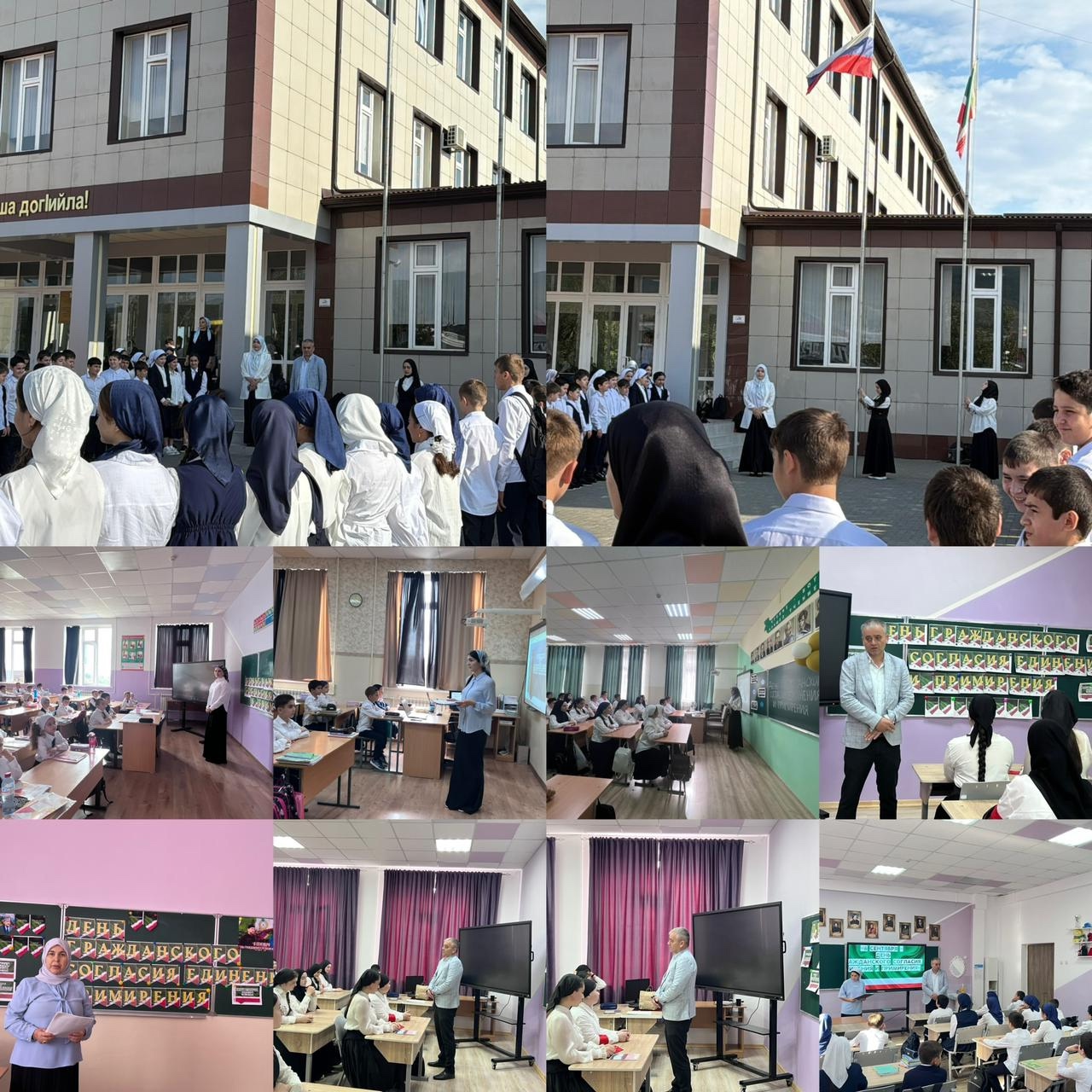 Сегодня почетное право поднять Государственный флаг Российской Федерации и Чеченской Республики представилась ученикам 11 класса.После исполнения гимна к учащимся обратился директор школы Эскиев Б.В. В своем выступлении Бувайсар Вахаевич рассказал, что День Чеченской Республики или День гражданского согласия и единения отмечается с 2002 года в соответствии с Указом Первого Президента ЧР, Героя России Ахмат-Хаджи Кадырова. С тех пор шестое сентября стало знаменательной датой в новой истории Чеченской Республики.Ахмат-Хаджи Кадыров объединил расколотое общество и остановил произвол и беззаконие, проведя референдум, на котором жители ЧР приняли Основной закон ЧР и сделали свой выбор – жить в составе Российской Федерации.Современная Чеченская Республика представляет из себя цветущий край, где восстановлены и построены новые объекты образования, культуры, здравоохранения, спорта.Глава Чеченской Республики Рамзан Кадыров уделяет пристальное внимание межнациональным вопросам.После линейки дети разошлись по своим кабинетам на свои уроки « Разговоры о важном» На уроке говорилось о том, что суть праздника «День гражданского согласия и единения» – спасти нацию от невосполнимых потерь, примирить народы, предотвратить нерешенные вопросы, кровавую месть.В единой и дружной семье сегодня в Чечне живут и трудятся -чеченцы, русские, ингуши, татары, казаки, кумыки, ногайцы, турки, аварцы, армяне, евреи и многие другие. Они принимают активное участие в социально-экономической, общественно-политической и культурной жизни республики, внося тем самым достойный вклад в развитие республики, установление межэтнического мира и согласия, а значит и консолидацию всего многонационального российского общества.